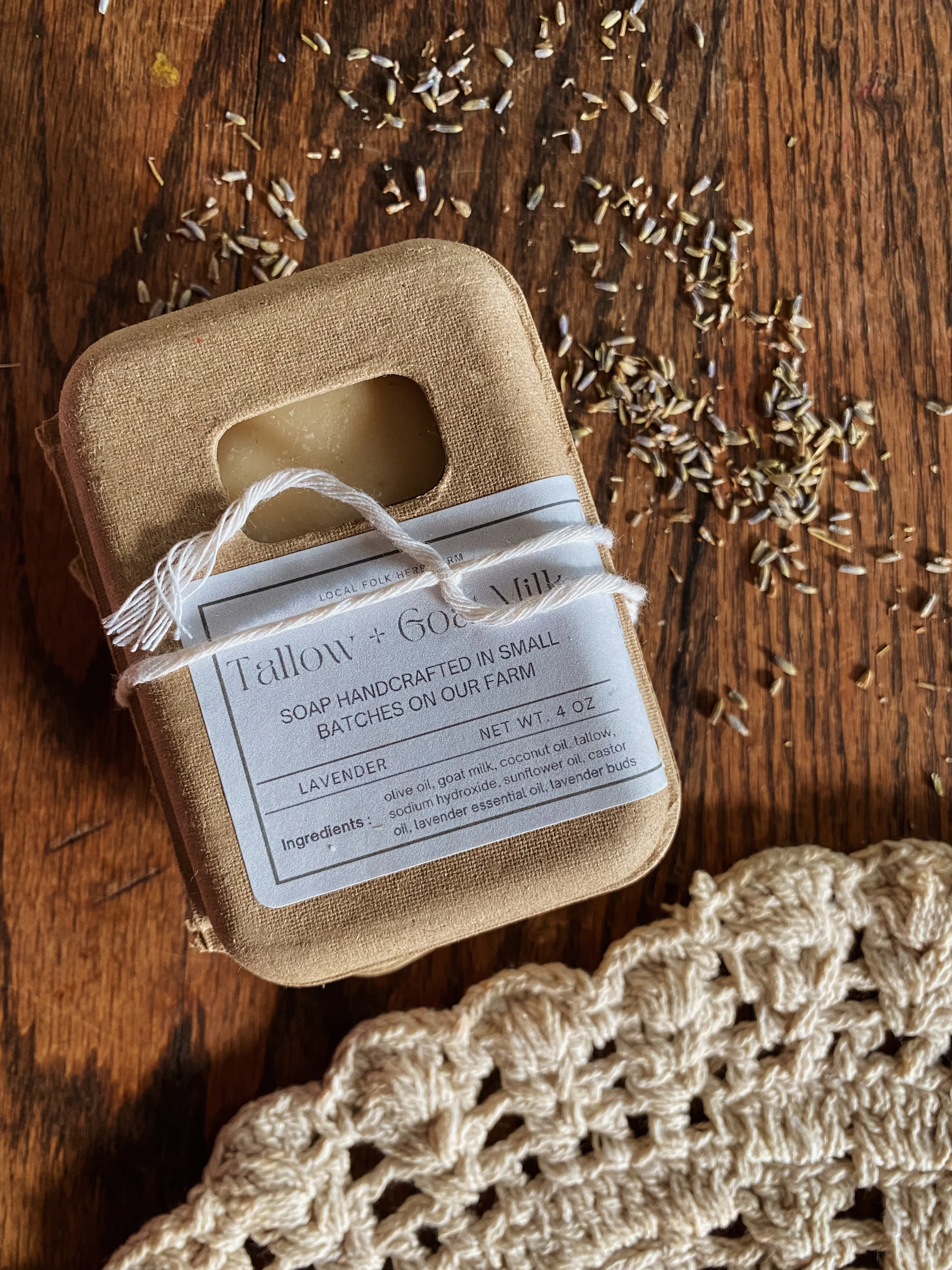 Shop the Farmstand Categories: Select a Category Home and Hearth Farmstead Honey The Tallow Collection Folk Body Care Infusions, Decoctions, and Brews Handmade Soap Lavender Tallow and Milk Soap $9.00 Oats + Honey Tallow and Milk Soap $9.00
